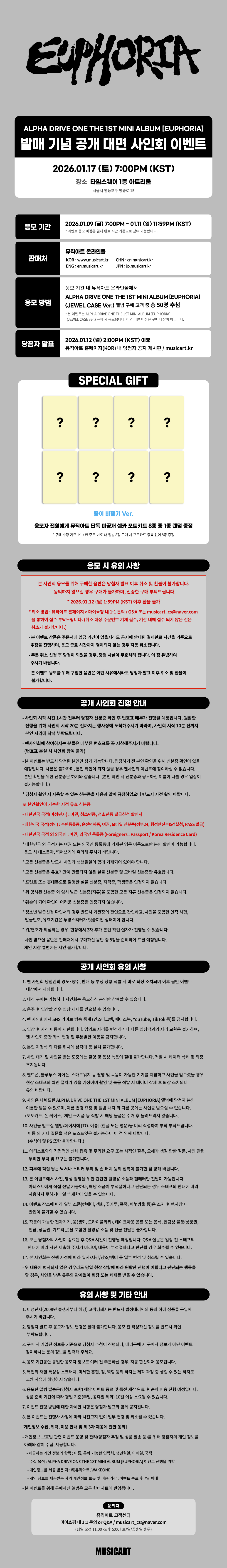 본 이벤트 상품은 공개 사인회 응모권이 포함된 상품입니다. 본 사인회 응모를 위해 구매한 음반은 당첨자 발표 이후 취소 및 환불이 불가합니다. 동의하지 않으실 경우 구매가 불가하며, 신중한 구매 부탁드립니다. [취소 안내] 취소 및 환불 접수 기한 : 2026/01/12 (월) 1:59PM (KST) 까지 * 취소 접수 방법 : 뮤직아트 홈페이지 > 마이쇼핑 내 1:1문의 / Q&A 또는 musicart_cs@naver.com을 통하여 접수 부탁드립니다. (‼️취소 희망 주문번호 기재 필수‼️, 기간 내에 접수 되지 않은 건은 취소가 불가합니다.) * 취소 접수는 취소 신청하신 일시를 기준으로 처리됩니다. (CS 처리 시간 이후 신청 건은 다음 영업일에 정상 처리 되오니, CS 운영 시간과 관계없이 취소 기한 내 취소 신청 주시면 취소 가능합니다.) ** 응모 기간 내 취소 신청 해주신 주문 건은 1월 12일 (월) 오전중으로 처리될 예정인 점 참고 부탁드립니다. ** * 취소 시 가상계좌 환불, 카드 승인 취소 및 한도 복구까지 시간이 소요됩니다. (결제 수단 및 은행, 카드사 별 상이) 취소 후 재구매 예정이실 경우, 위 사유로 기간 내 구매를 못하였을 경우 추가 구매가 불가하니 응모 마감 당일 취소 시 유의 바랍니다. * 응모 정보의 양식 오류(-,.등 기호 누락)시, 별도로 취소 후 재구매하지 않으셔도 정상 응모 되는 점 참고 부탁드립니다. * 응모 수량 추가 희망하실 경우, 동일한 응모자 정보로 추가 구매시 정상 합산되어 별도로 취소 후 재구매 하실 필요 없이 추가 응모가 가능합니다. * 주문 취소 신청 후 당첨이 되었을 경우, 당첨 사실이 무효처리 됩니다. 이 점 유념하여 주시기 바랍니다.* 본 이벤트 응모를 위해 구입한 음반은 어떤 사유에서라도 당첨자 발표 이후 취소 및 환불이 불가합니다. [응모 양식 안내] *권장 사항 응모시, 아래 양식에 맞추어 기입을 권장드립니다. - 응모자 이름 (Name) : 내국인 한글, 외국인 영문 이름 기입- 연락처 (Phone number) : XXX-XXXX-XXXX (하이픈, - 기재)- 생년월일 (Birth) : YY.MM.DD (년.월.일 순으로 온점 구분하여 기재)- 이메일 (e-mail) : 연락이 가능한 이메일 주소 작성 이하 옵션 : 내용 확인 후 동의 하시는 경우에만 구매가 가능하며, 확인 후 체크 부탁드립니다.* 기재하신 응모 정보는 응모 마감 후 수정이 불가합니다. 기재하신 내용을 꼼꼼히 체크 후 구매 권장드립니다. [발송 안내] 한 주문 번호에 앨범 8장 구매 시 중복 없이 포토카드 8종이 증정됩니다. 여러 개의 주문 번호로 나눠서 구매할 경우 포토카드가 중복으로 증정될 수 있으니 이 점 유의해 주시기 바랍니다.