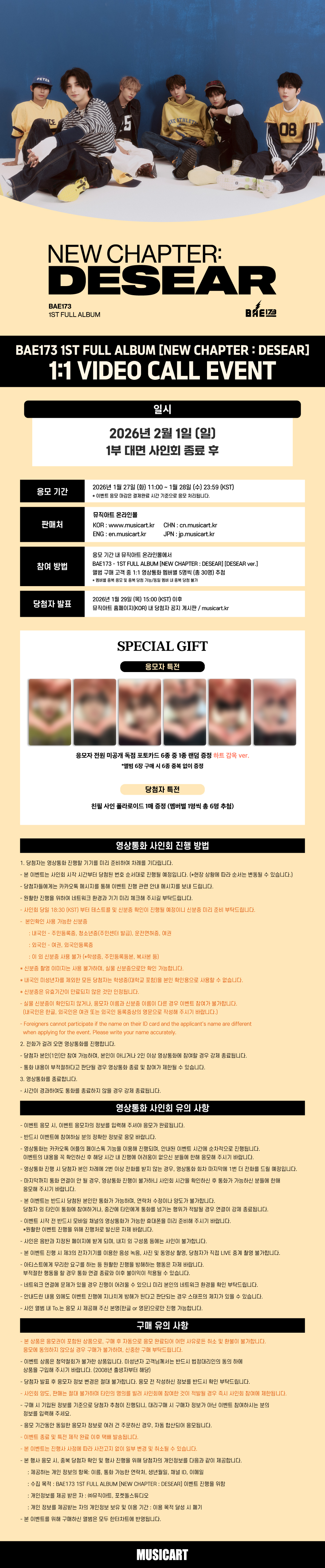 본 이벤트 상품은 응모권이 포함된 상품입니다.구매 완료 후 자동 응모되며, 응모권 사용 처리 되어 취소 및 환불이 불가하니 주의 바랍니다.** 미동의시 구매 불가합니다. ** 특전, 상품 누락 및 하자로 인한 교환 신청은 상품 수령 후 2주 안으로 문의 부탁드립니다.(누락 및 하자 확인용으로 개봉 시 동영상을 요청할 수 있습니다.) 한 주문 번호에 앨범 6장 구매 시 중복 없이 포토카드 6종이 증정됩니다. 여러 개의 주문 번호로 나눠서 구매할 경우 포토카드가 중복으로 증정될 수 있으니 이 점 유의해 주시기 바랍니다. ![]() ![]() ![]() |