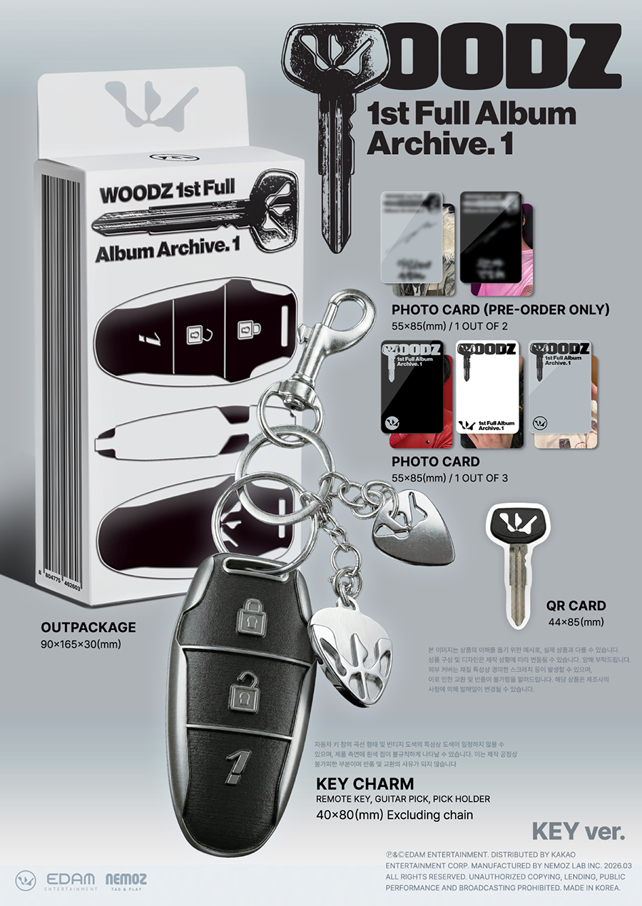 *앨범 사양- OUTPACKAGE : 90*165*30 (mm) / 1종- KEY CHARM : REMOTE KEY, GUITAR PICK, PICK HOLDER / 40*80 (mm) Excluding chain / 1종- QR CARD : 44*85 (mm) / 1종- PHOTO CARD : 55*85 (mm) / 3종 중 랜덤 1종 삽입# PRE-ORDER ONLY- PHOTO CARD : 55*85 (mm) / 2종 중 랜덤 1종 삽입 |