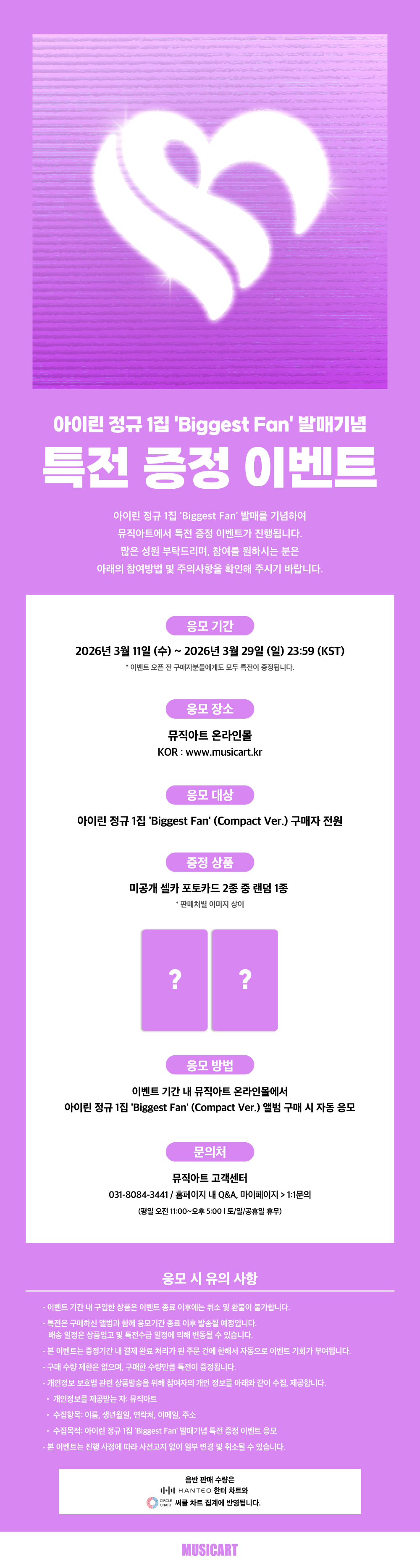 본 상품은 응모 기간 내에서만 취소, 환불이 가능합니다.공지 확인 부탁드립니다. [취소 안내] 취소 및 환불 접수 기한 : 2026/03/29 (일) 23:59 (KST) 까지 * 취소 접수 방법 : 뮤직아트 홈페이지 > 마이쇼핑 내 1:1문의 / Q&A 를 통하여 접수 부탁드립니다. (‼️취소 희망 주문번호 기재 필수‼️, 기간 내에 접수 되지 않은 건은 취소가 불가합니다.) * 취소 접수는 취소 신청하신 일시를 기준으로 처리됩니다. (CS 처리 시간 이후 신청 건은 다음 영업일에 정상 처리 되오니, CS 운영 시간과 관계없이 취소 기한 내 취소 신청 주시면 취소 가능합니다.) * 취소 시 가상계좌 환불, 카드 승인 취소 및 한도 복구까지 시간이 소요됩니다. (결제 수단 및 은행, 카드사 별 상이) 취소 후 재구매 예정이실 경우, 위 사유로 기간 내 구매를 못하였을 경우 추가 구매가 불가하니 응모 마감 당일 취소 시 유의 바랍니다.