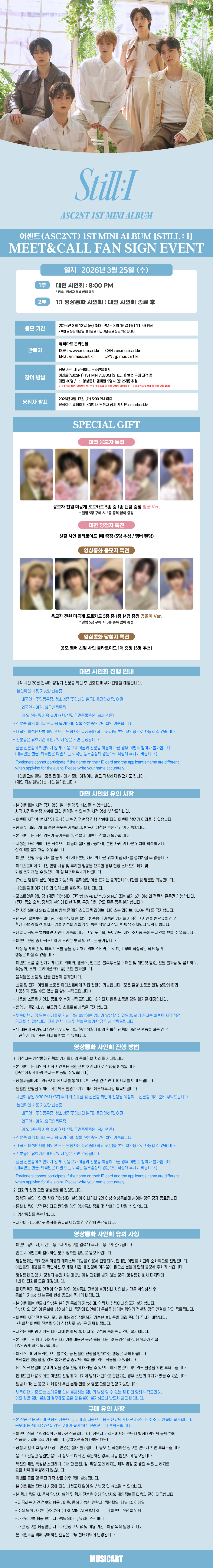 본 상품은 [1:1 영상통화] 응모 상품입니다. 공지 사항 및 유의 사항 숙지 후 구매 부탁드립니다. 본 이벤트 상품은 응모권이 포함된 상품입니다.구매 완료 후 자동 응모되며, 응모권 사용 처리 되어 취소 및 환불이 불가하니 주의 바랍니다.** 미동의 시 구매 불가합니다. ** 한 주문 번호에 앨범 5장 구매 시 중복 없이 포토카드 5종이 증정됩니다. 여러 개의 주문 번호로 나눠서 구매할 경우 포토카드가 중복으로 증정될 수 있으니 이 점 유의해 주시기 바랍니다.