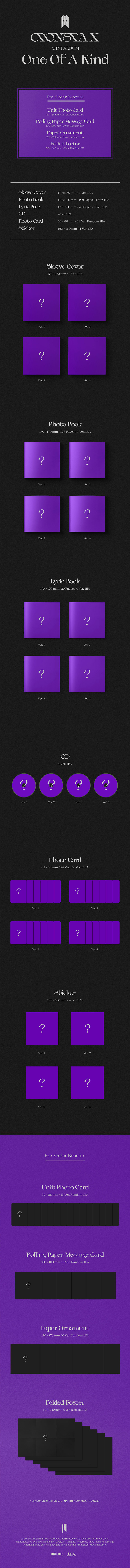 *앨범 사양 - OUT SLEEVE : 170x170mm / 1종 (버전 별 이미지 상이) - PHOTO BOOK : 170x170mm / 128p / 1종 (버전 별 이미지 상이) - LYRIC BOOK: 170x170mm / 20p / 1종 (버전 별 이미지 상이) - DISC : 1종 (버전 별 이미지 상이) - PHOTO CARD : 62x88mm / 6종 중 1종 랜덤 삽입 (버전 별 이미지 상이) - STICKER : 160x160mm / 1종 삽입 (버전 별 이미지 상이) * PRE-ORDER-BENEFIT - UNIT PHOTO CARD : 62x88mm / 15종 중 랜덤 1종 삽입 (버전 별 이미지 동일) - ROLLING PAPER MESSAGE CARD : 160x160mm / 6종 중 랜덤 1종 삽입 (버전 별 이미지 동일) - PAPER ORNAMENT : 170x170mm / 6종 중 랜덤 1종 삽입 (버전 별 이미지 동일) - FOLDED POSTER : 510x340mm 6종 중 랜덤 1종 삽입 (버전 별 이미지 동일) |